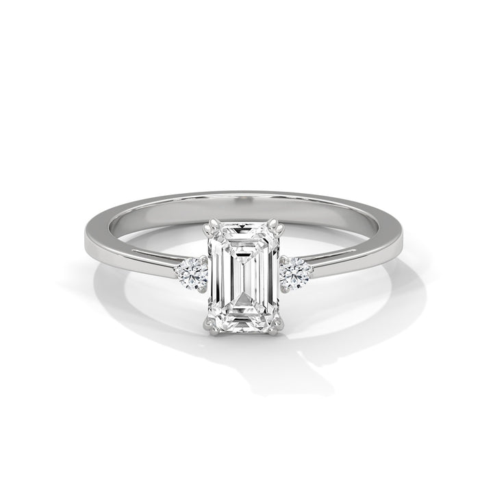 Turn every moment into a celebration with our Emerald Cut Diamond Trio Ring — a classic yet contemporary masterpiece. At the heart of this ring lies a stunning emerald-cut diamond, flanked by two brilliant round side stones, creating a graceful balance of symmetry and sparkle.