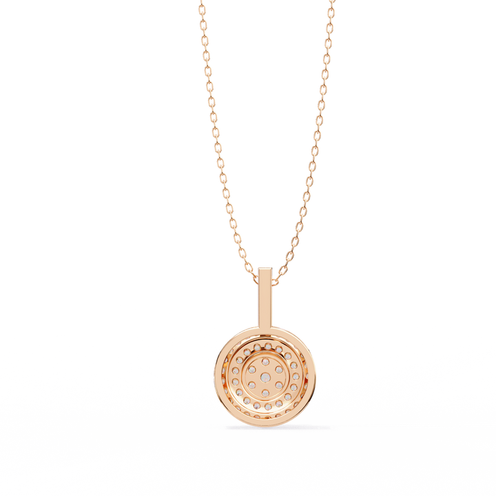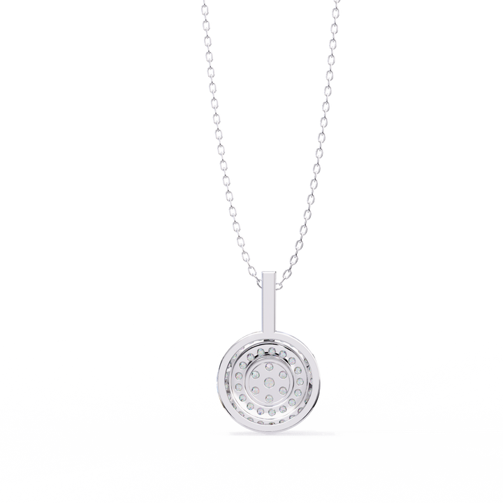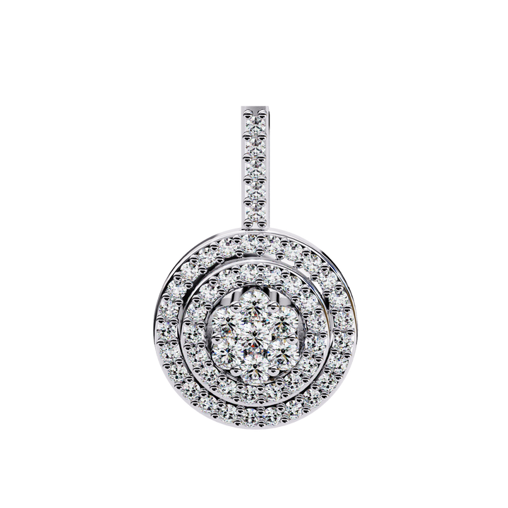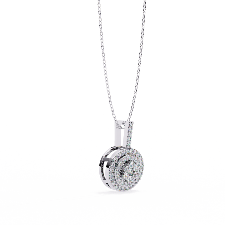 Elevate your style with this stunning double halo circle pendant, featuring a captivating round diamond at its heart. Surrounded by two meticulously crafted halos of pavé-set diamonds, this pendant delivers maximum brilliance from every angle. The elegant circular design symbolizes eternity and unity, making it a meaningful gift for a loved one or a timeless addition to your own collection. Expertly crafted with a smooth, polished finish and suspended from a delicate chain, this piece blends classic charm with modern elegance.