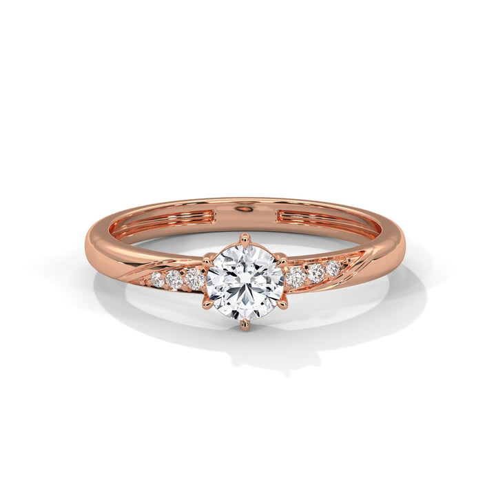 This stunning engagement ring features a brilliant round-cut center diamond, beautifully flanked by shimmering side stones that enhance its radiance. The graceful taper of the band draws the eye toward the centerpiece, creating a timeless and sophisticated look that never goes out of style.
